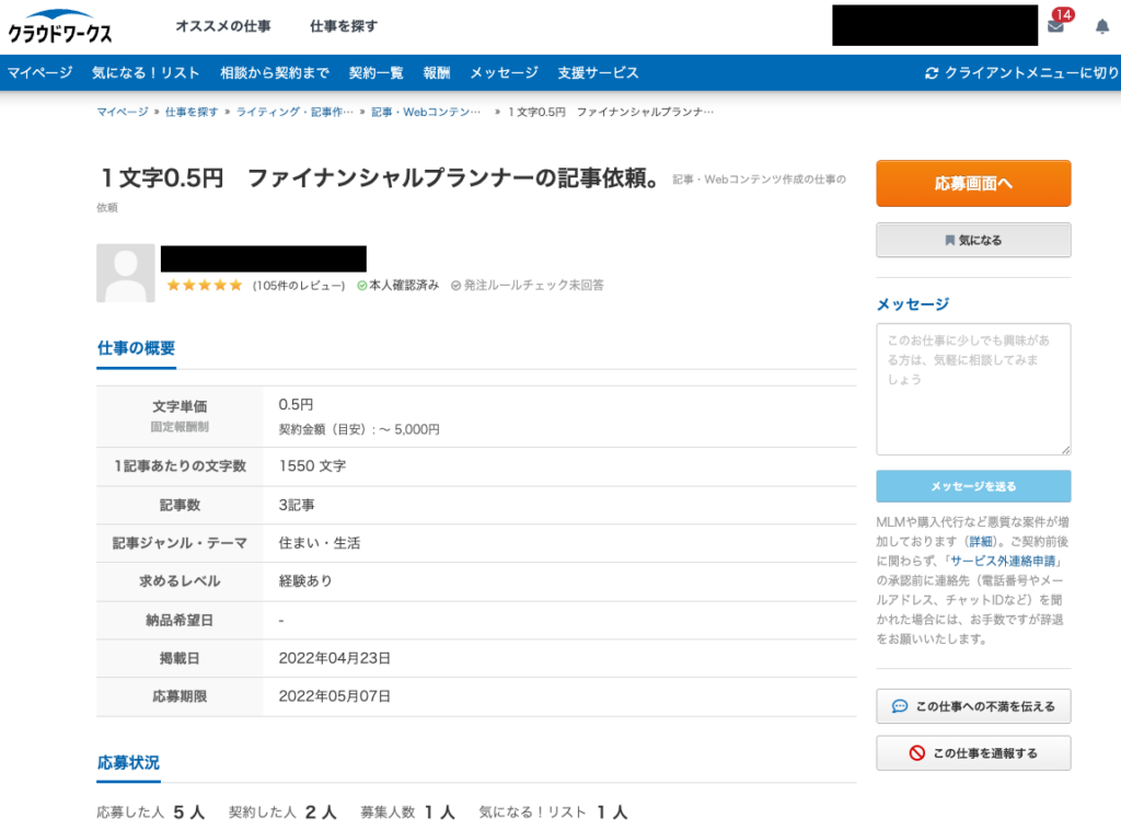 こちらは、私が未経験で初めて受注した「1文字0.5円 ファイナンシャルプランナーの記事依頼」という案件です。